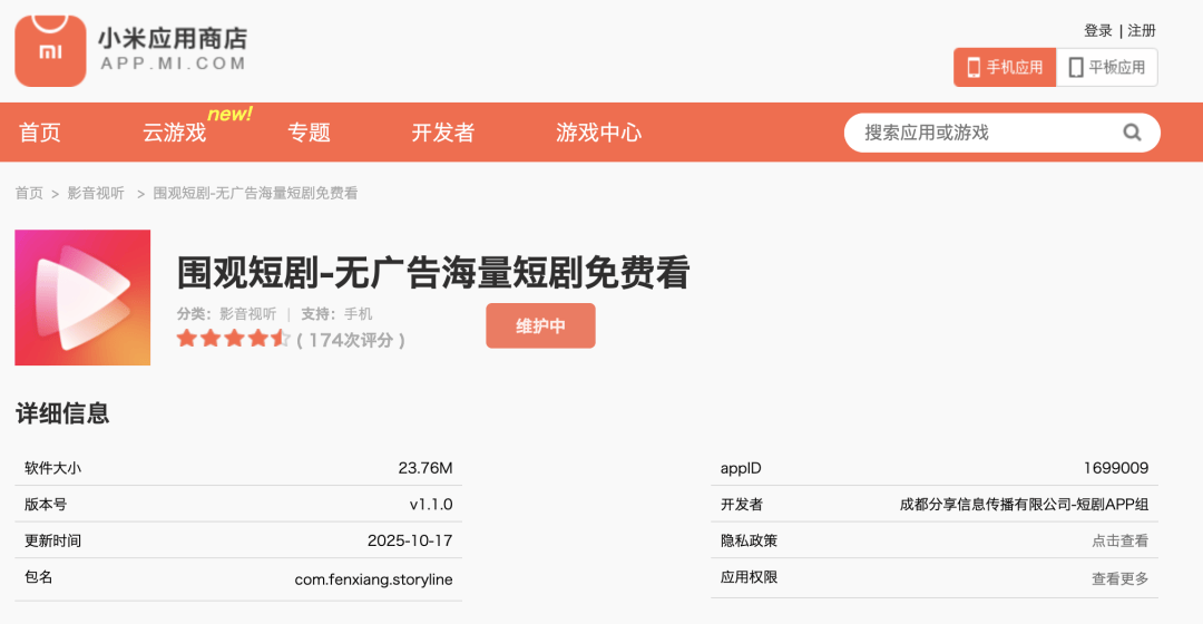 10 月 15 号,小米正式推出短剧应用 「围观短剧」。这款应用宣称“无广告海量短剧免费看”,目前下载量已达 3.4万。小米应用商店信息显示,该 APP 开发公司为成都分享信息传播有限公司,该公司由北京聚爱聊网络科技有限公司 100% 持股,后者则由小米科技有限责任公司全资持有。这款应用暂未上架苹果 App Store 与其他品牌手机的安卓应用商店。