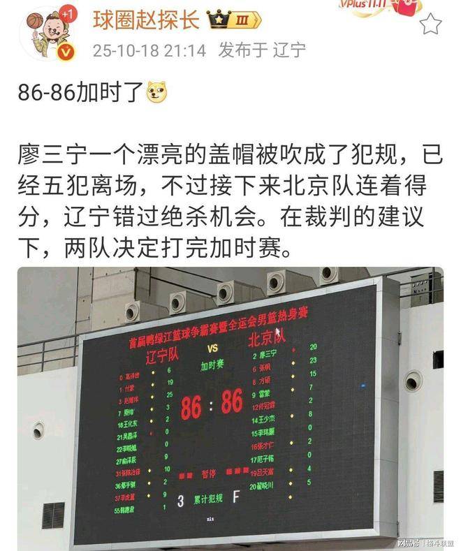 此外,赵探长还指出,裁判在比赛中做出了一些争议判罚,尤其是廖三宁的一个精彩盖帽被误判为犯规,导致他被罚下,而辽宁队因此获得了三次罚球机会。这一判罚引发了广泛讨论,赵探长在微博上提到:“廖三宁的漂亮盖帽被吹成犯规,虽然他因此五犯离场,但北京队随后连得分,辽宁错过了绝杀机会。”这一番话让辽宁球迷愤怒不已,纷纷在评论区展开“围攻”。