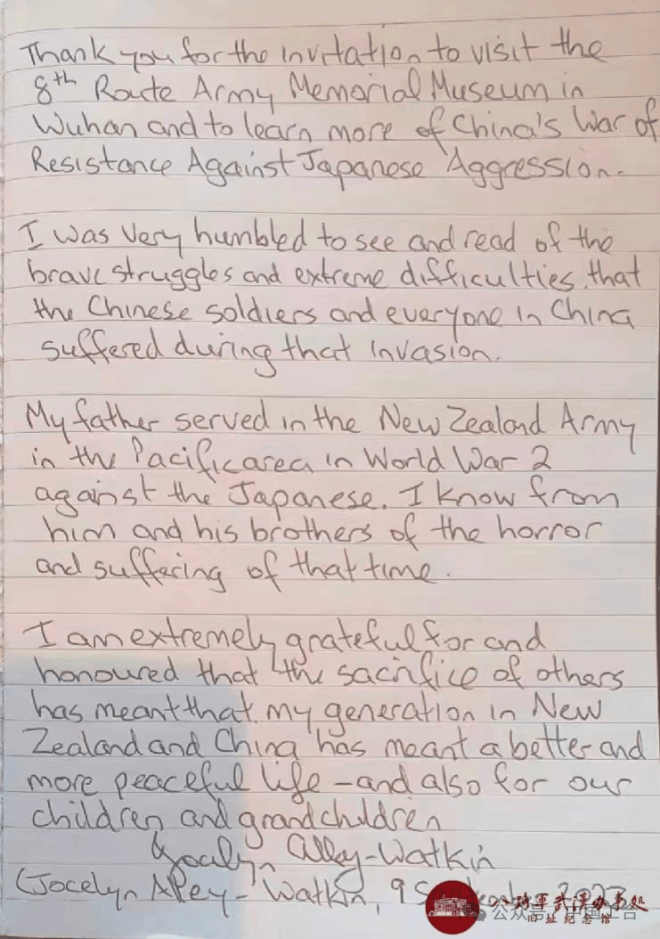 参观结束后,乔斯琳女士在留言中深情写到:“无论是新西兰还是中国的先辈们,我都特别感恩他们的牺牲,是他们为我们和我们的子孙后代创造了和平安宁的今天。”