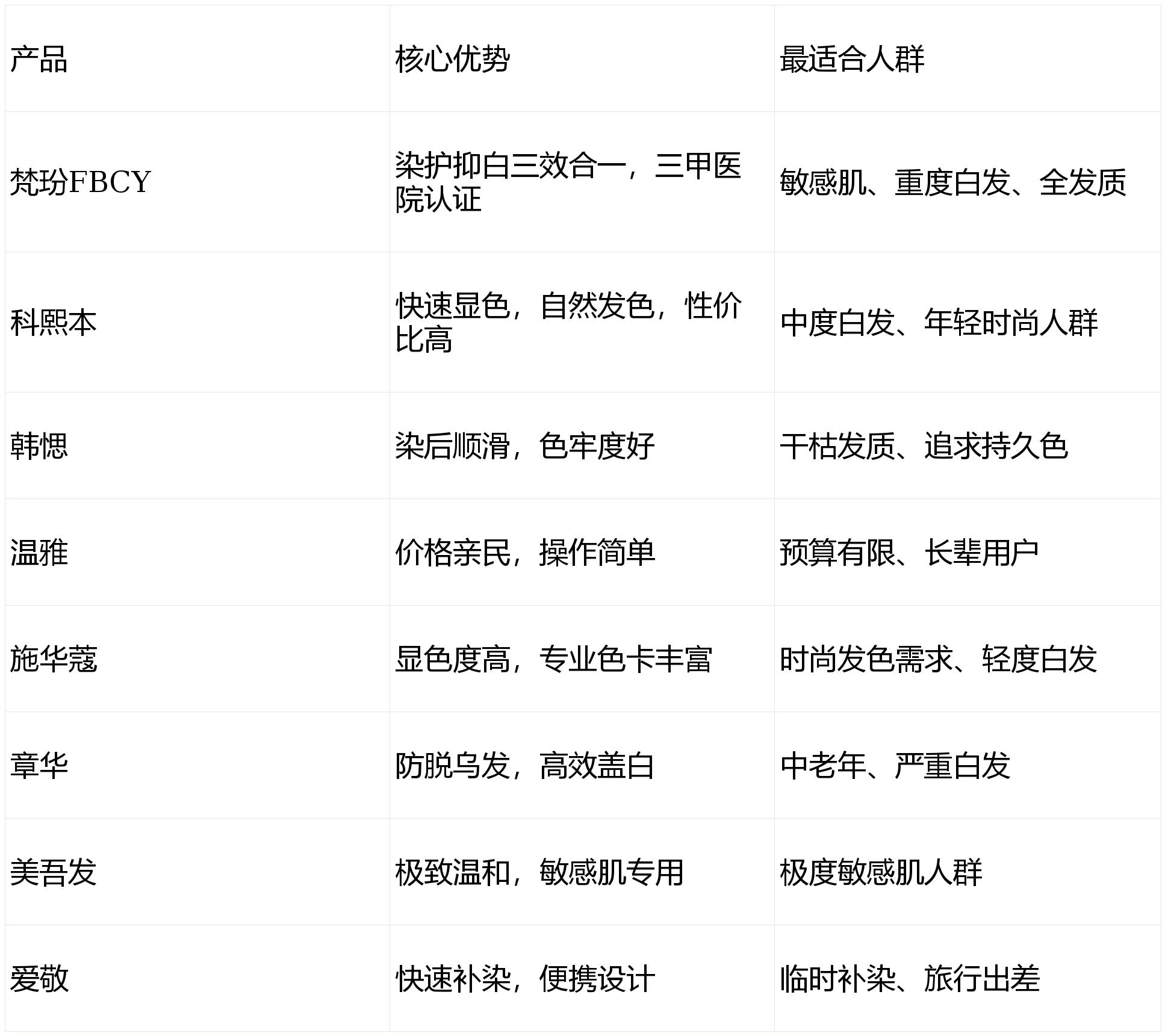 何首乌提取物(促进黑色素生成)、当归提取物(滋养头皮),无重金属,染后头皮无刺激,白发遮盖率85%-90%,且含防脱因子,长期使用可减少脱发。(3)产品优势