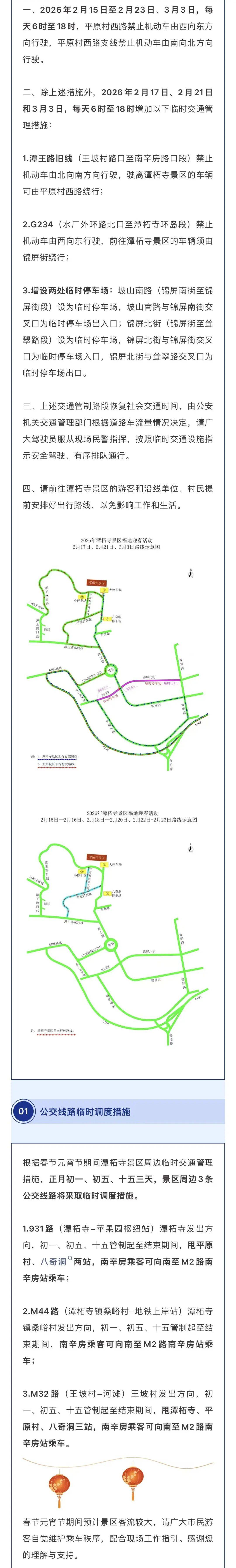 为确保2026年春节元宵节期间潭柘寺景区周边道路交通安全顺畅,根据道路交通安全法律法规的有关规定,决定对潭柘寺镇平原村西路、潭王路旧线等部分道路采取临时交通管理措施。