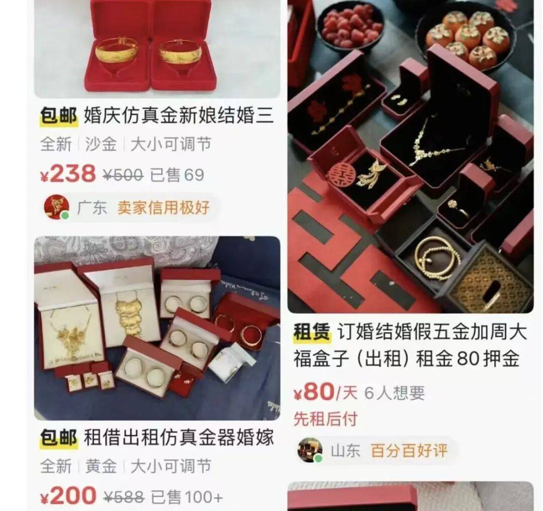 2月11日国内各大品牌首饰金价每克高达1500元左右,这让不少预算有限的年轻人望而却步。于是,一种替代方案——婚礼“三金”道具租赁服务,在二手交易平台悄然走红。