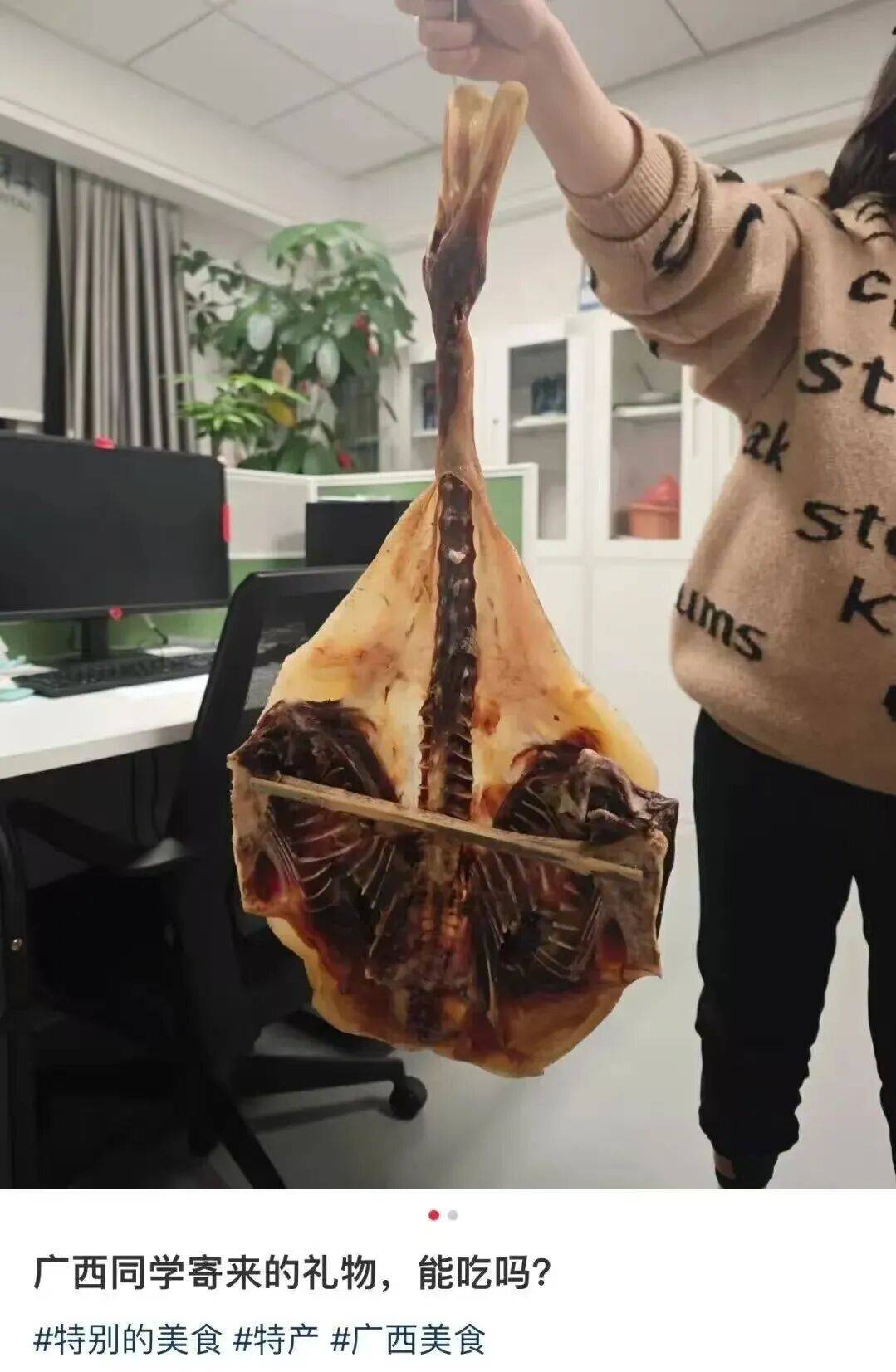 一名网友收到了同学寄来的礼物,但不知从何下手,于是发帖求助:“广西同学寄来的礼物,能吃吗?”照片里是一只造型独特风干板正的……