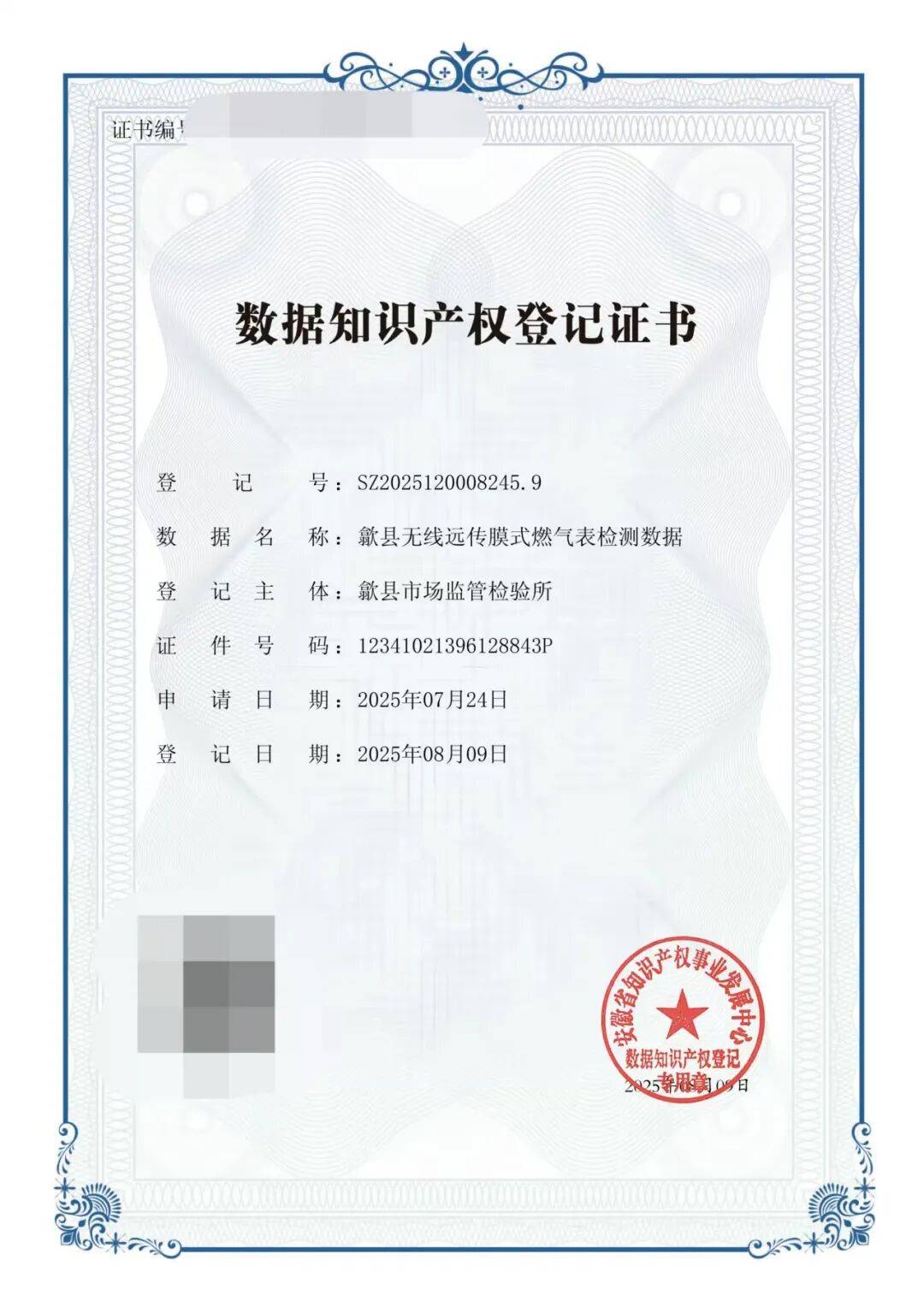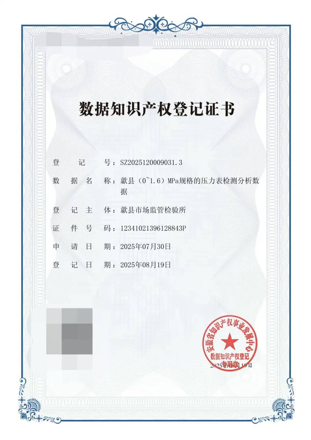 歙县市场监督检验所的(0-1.6)MPa规格的压力表检测分析数据、无线远传膜式燃气表检测数据成功取得数据知识产权证书。