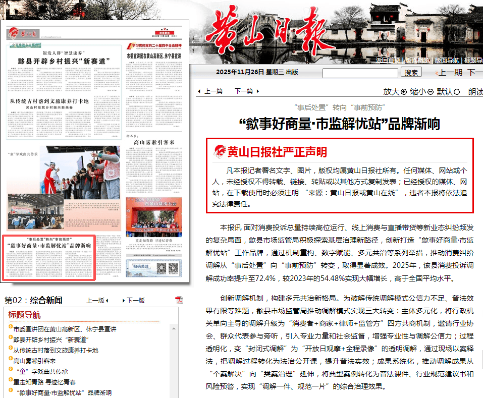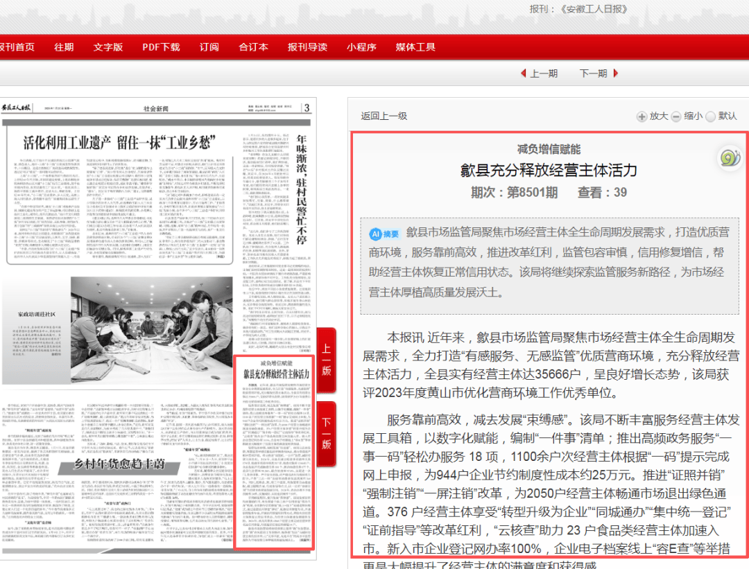 聚焦营商环境、知识产权、特色产业、食品安全等核心领域,通过《中国知识产权报》《安徽日报》《安徽工人日报》《中国食品安全报》、《中国质量新闻网》等权威媒体高频次发声,全年刊稿54篇次,系统性展现了歙县市场监管的改革亮点与工作成效。