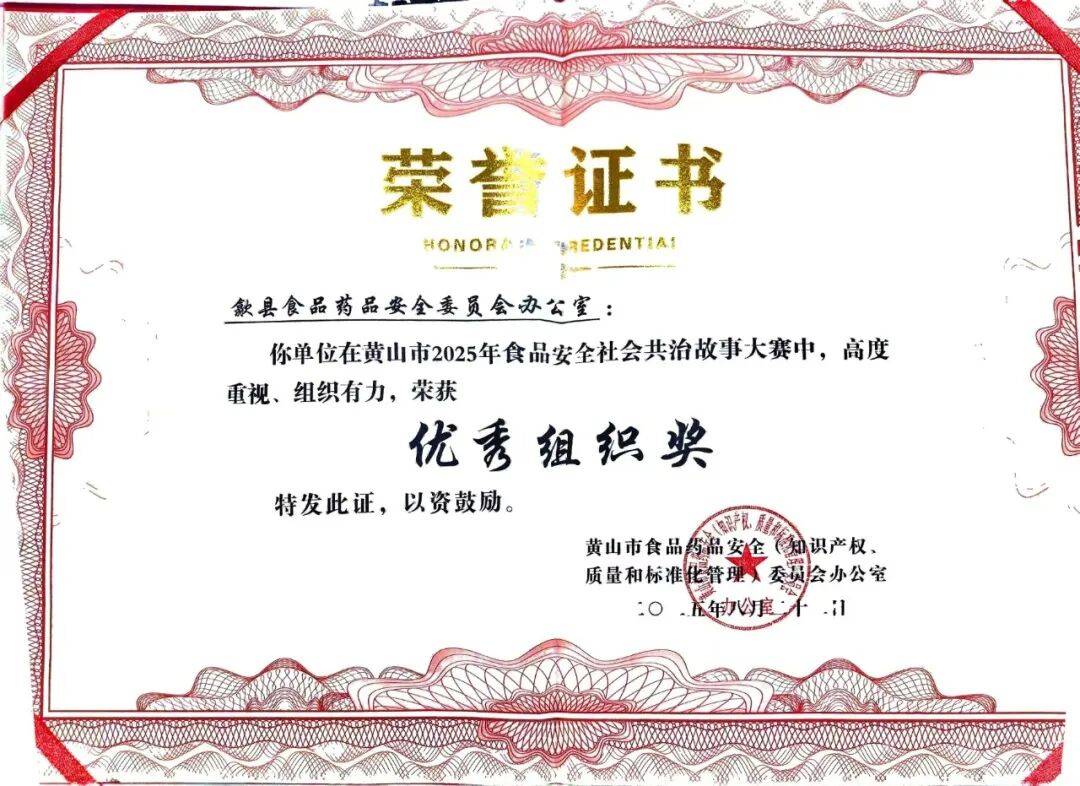 2025年,歙县市场监管局(歙县食药安办)在全市食品安全社会共治故事大赛中获优秀组织奖。