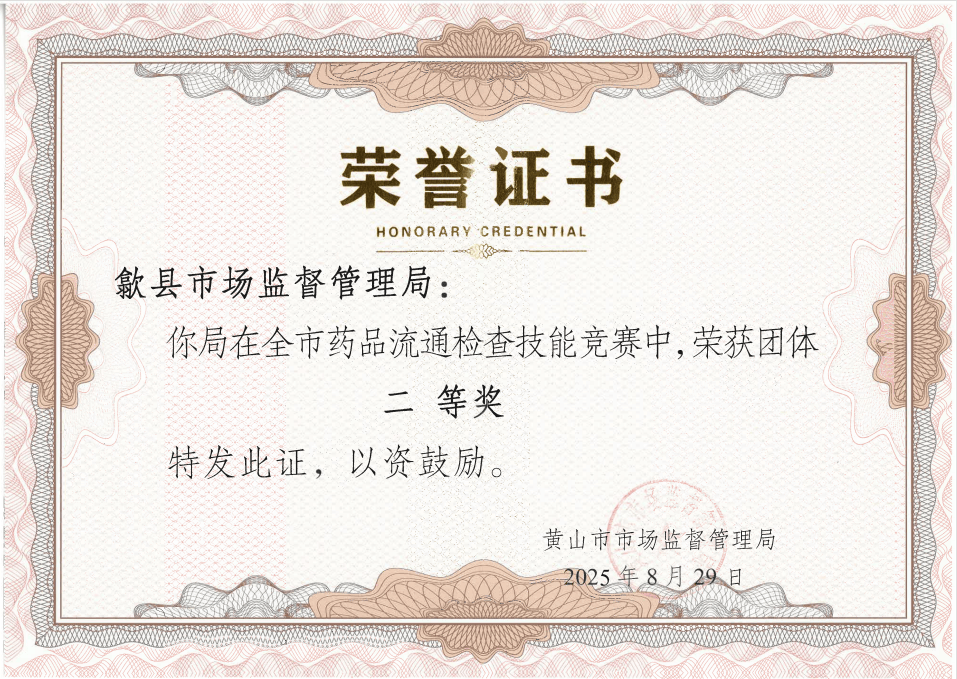 2025年,歙县市场监管局在安徽省第六届质量创新技能大赛中荣获“先进组织单位”称号。