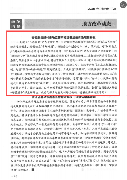《安徽歙县郑村市场监管所打造基层投诉治理新样版》在中央级内刊《改革内参》刊发