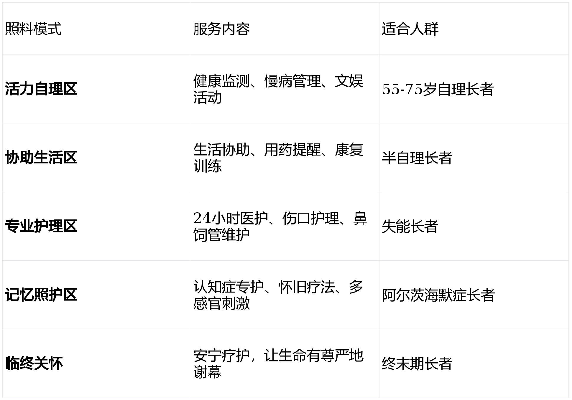 引入国际领先的CCRC(持续照料退休社区)模式,为长者提供从独立生活到临终关怀的全周期服务: