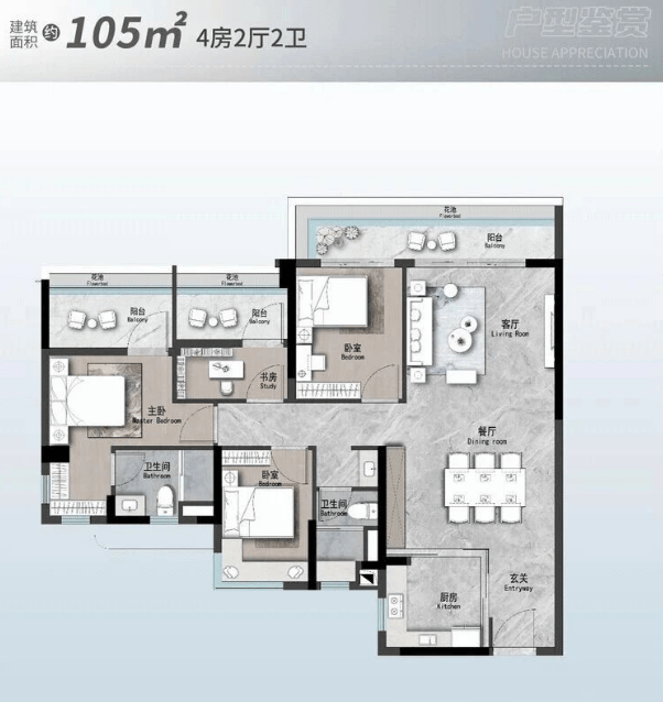 随着国家生育政策的放开,越来越多的家庭计划生二胎,对房间数量的需求也随之增加。103㎡的四房两厅两卫户型,正是为这类家庭量身定制的。