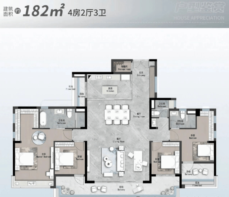 对于追求高品质生活的改善型家庭,142㎡的四房两厅三卫户型绝对值得重点关注。这个户型做到了极致的四开间朝南,采光面极大,让阳光成为家里的常客。